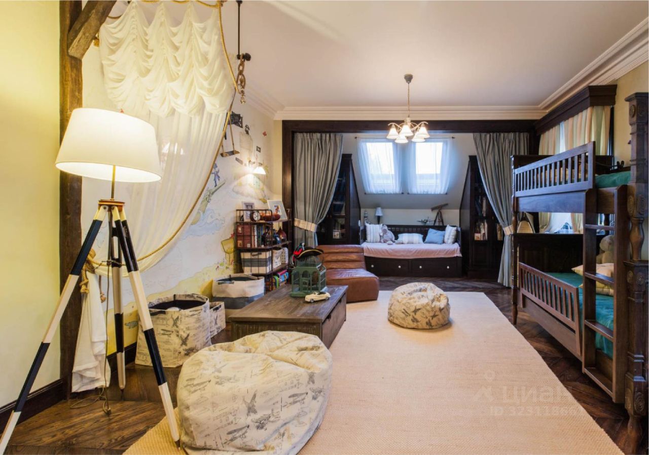 Второй — мастер-спальня с камином, балконом и гардеробной, две спальни, игровая комната. Мансарда — домашний кинотеатр, уединённая спальня с камином.