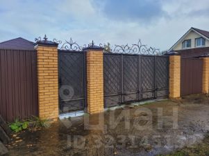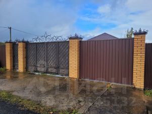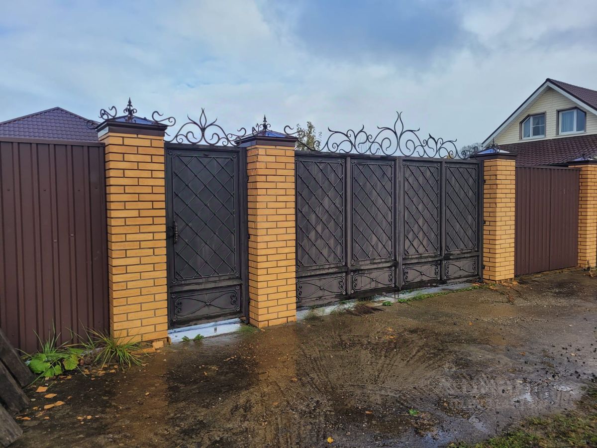 Забор - профнастил между кирпичными колоннами. Ворота металлические, кованые: механические. Возможно автоматизировать.