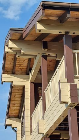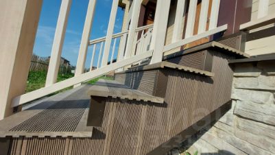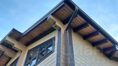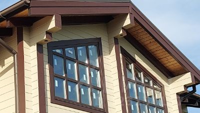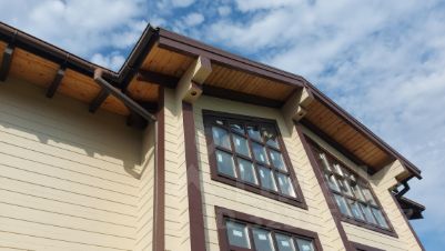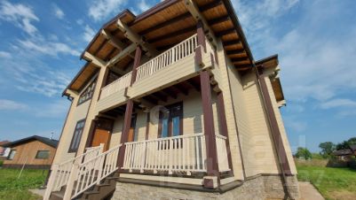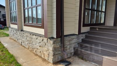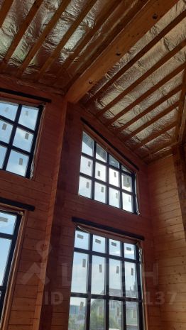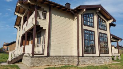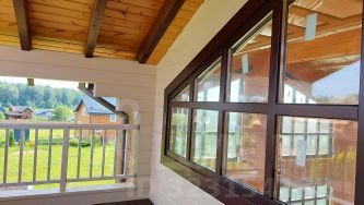 Дом строился как дом-образец для привлечения клиентов. Фундамент железобетонный с цокольным этажем и ж.б. плитой перекрытия. Энергоэффективный клееный брус 202х190 мм. премиум сегмента, произведен на заводе ЗАО Тамак, принадлежащем австрийским инвесторам, сертифицирован по нормам для стран ЕС. Фасад перекрашен в 2024г., лакокрасочные материалы - Tikkurila, обработка торцов Sikkens. Покрытие кровли - битумная черепица Katepal финского производства. Окна - деревянные стеклопакеты из лиственницы, что полностью соответствует концепции деревянного дома. Пол террасы, крыльца, балконов и ограждения выполнены из доски и элементов ДПК Terradeck (смонтированы в 2024г.) Основание пола железобетонная плита 150 мм.
