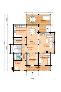 На первом этаже: гостиная со вторым светом, кухня, столовая, холл, сан. узел, гостевая комната, кладовая, прихожая, тех. помещение, терраса.