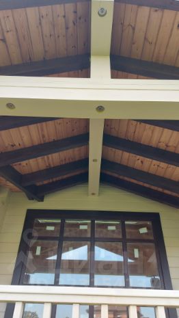 Высокие потолки. Балки перекрытия клееные, визуального качества, высотой 240 мм., проектировались как видимые в интерьере