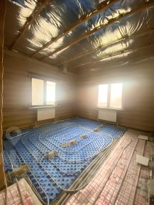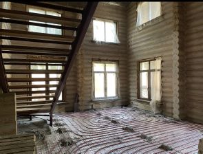 Готовность по ремонту 80%, застелить пол на первом этаже, установить сантехнику.
