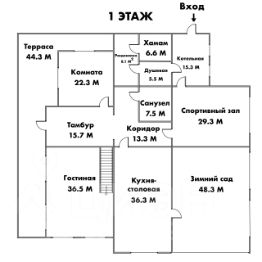 На первом этаже расположены: гостиная-38,6 кв. м с большим камином Brunner(Германия), кухня-столовая 36,3 кв.м., гостевая спальня-22,3 кв.м., утепленное помещение-48 кв.м. под зимний сад с панорамным остеклением в пол, так же можно использовать под жилую просторную комнату. спортивный зал 29,3 кв.м., прихожая -15,7 кв.м., просторный холл -13,3 кв.м., раздевалка-8,1 кв.м, два сан.узла -7,5 и 5,5 кв.м., Хамам- 6,6 кв.м., также расположена котельная-15,3 кв.м. Из Гостиной и спальни можно выйти на открытую террасу- 44,3 кв.м.