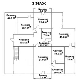 На втором этаже расположены: 5 просторных спален- 45,8 кв.м., 31,9 кв.м., 22,4 кв.м., 22,4кв.м., 18,0 кв.м, гардеробная-10,4 кв.м., 2 сан/узла-10,5 кв.м. и 7,5 кв.м., Лоджия 44,2 кв.м. с выходом одной из спален. Также есть балкон-5,8 кв.м. с выходом еще с одной спальни.
