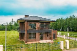 Коттедж построен согласно концепции проекта: фундамент ленточный/ монолитная плита, стены — пустотелый керамический кирпич, перекрытия — ж/б плиты, фасад облицован декоративной плиткой и доской, кровля — натуральная черепица, деревянные окна с двойными стеклопакетами, терраса с деревянным настилом на фундаменте.