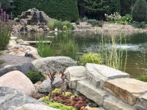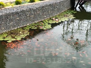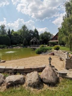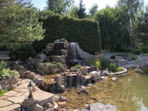 Чистый пруд площадью около 6 соток с водопадом, декоративными рыбками и растениями и пляжной зоной.