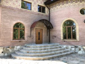 Фундаментные блоки, монолитные и пеноблочные стены, облицовка кирпичом. Перекрытия — ЖБ плиты (цоколь/1 этаж) и дерево.