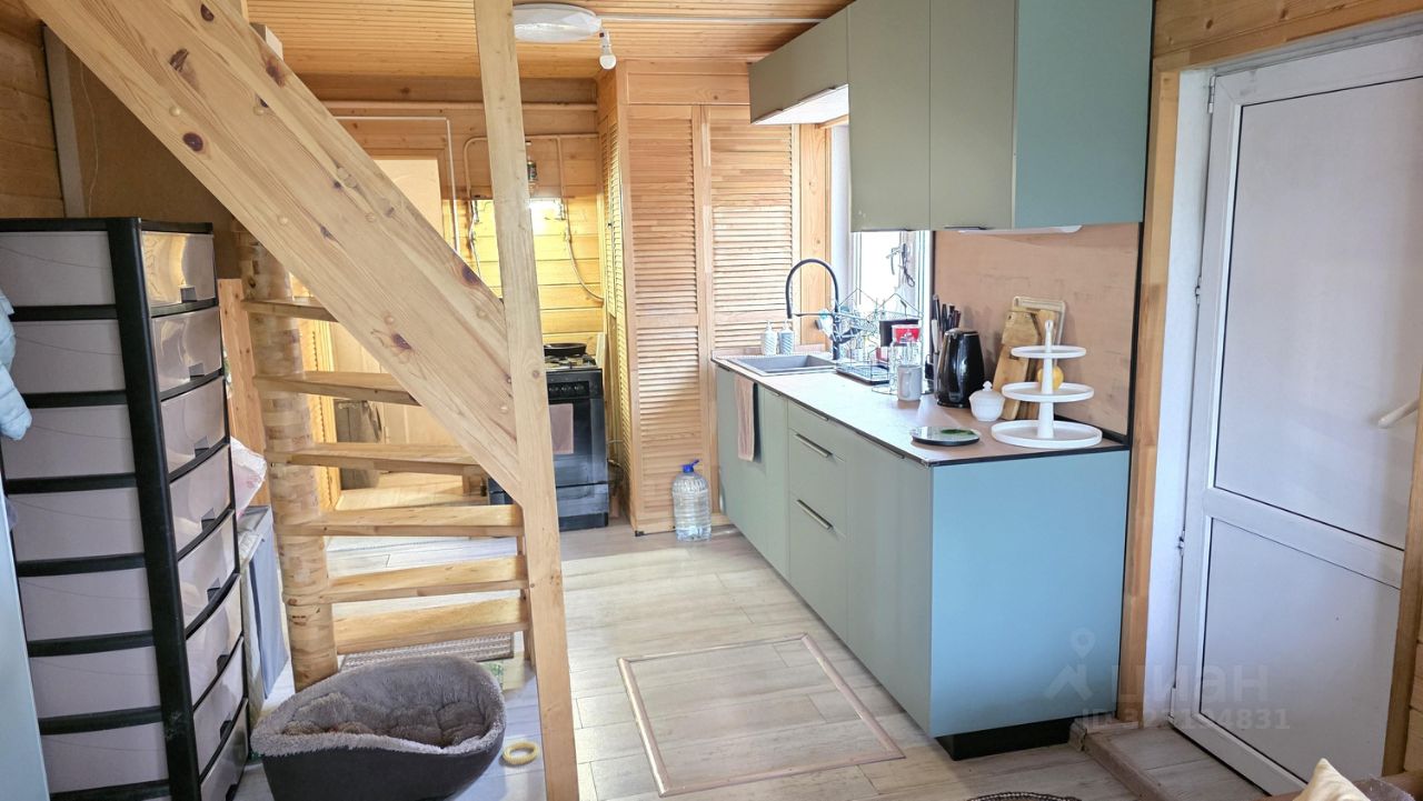 Зона кухня- столовая отделка блокхаус, остальная часть первого этажа - обои, ламинат, второй этаж - вагонка, окрашеная в бежевый цвет.