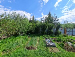 Участок: правильной формы, культивирован, огорожен металлическим забором. Имеются 2 въезда: 1-й с главной дороги, 2-й со второстепенной. Участок сухой и ухоженный (дополнительно завозилась земля) с плодовыми деревьями и кустарниками, аккуратный подстриженный газон. У дома зона для отдыха, обеденный стол с лавками.
