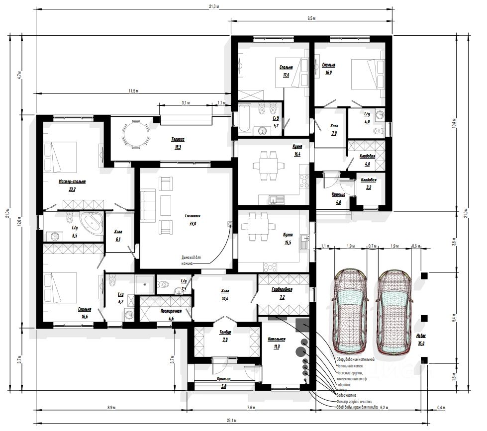 Продается одноэтажный дом на пять спален в КП Эсквайр парк. Параметры: 264,4 кв.м, участок 14,48 соток, со всеми центральными коммуникациями.