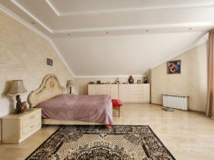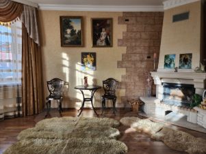 Дом: 245 м², кирпичный, 2 этажа, современная отделка, коммуникации (электричество, вода, канализация —централизованные), 3 спальни на 2 этаже, 2 санузла, 2 комнаты на мансарде, кухня-гостинная, каминный зал.