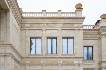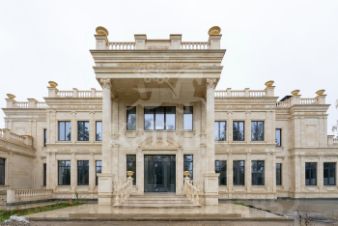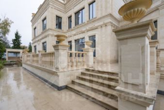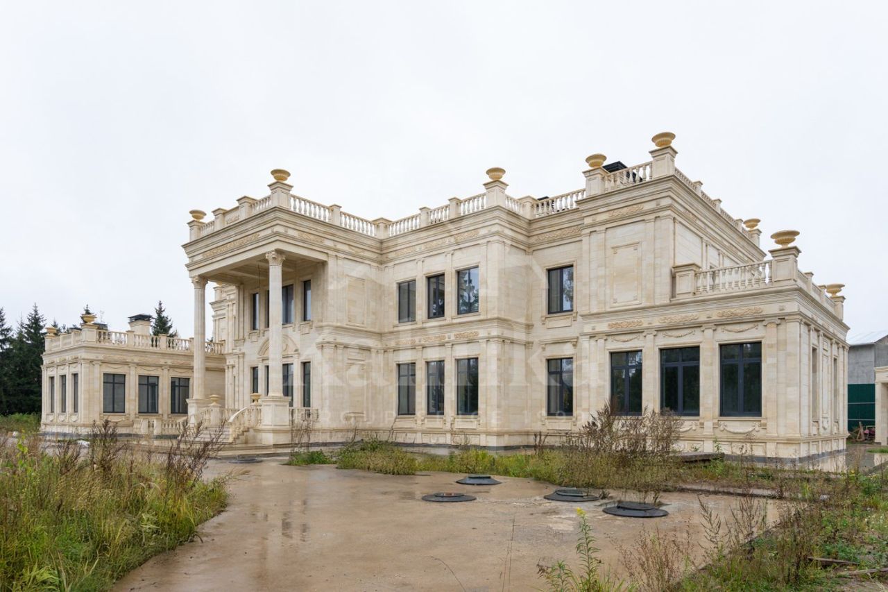Дом расположен в старой части поселка, в тихом и уединенном месте. Фасад дома отделан натуральным камнем, украшен колоннами, балясинами и барельефами. Внутреннее состояние дома "без отделки". Большая площадь остекления, очень высокие потолки, гараж на 4 машины, 6 спален, блок для персонала.