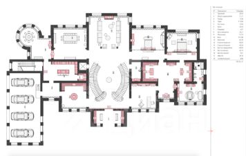 1 этаж: прихожая, холл, гардеробная, гостевой санузел, гараж на 4 машины, кухня, кладовая, зона завтраков, столовая, каминный зал, мастер-блок (2 спальни, гардеробная, ванная комната, кабинет).