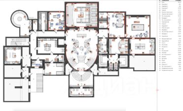 Цоколь: холл, кладовые, погреб, комната персонала, техническое помещение, постирочная, санузел, сезонная гардеробная, рабочая кухня, оружейная, салон, кинотеатр, бильярдная, бар, хаммам, сауна, купель, санузел.