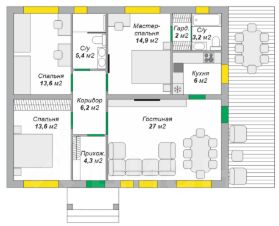Продуманный (на участке Вы не увидите никаких висячих проводов, все коммуникации проходят под землей, буферная зона между мастер-спальней и остальными спальнями, дверь из гостиной на улицу - можно добавить террасу).