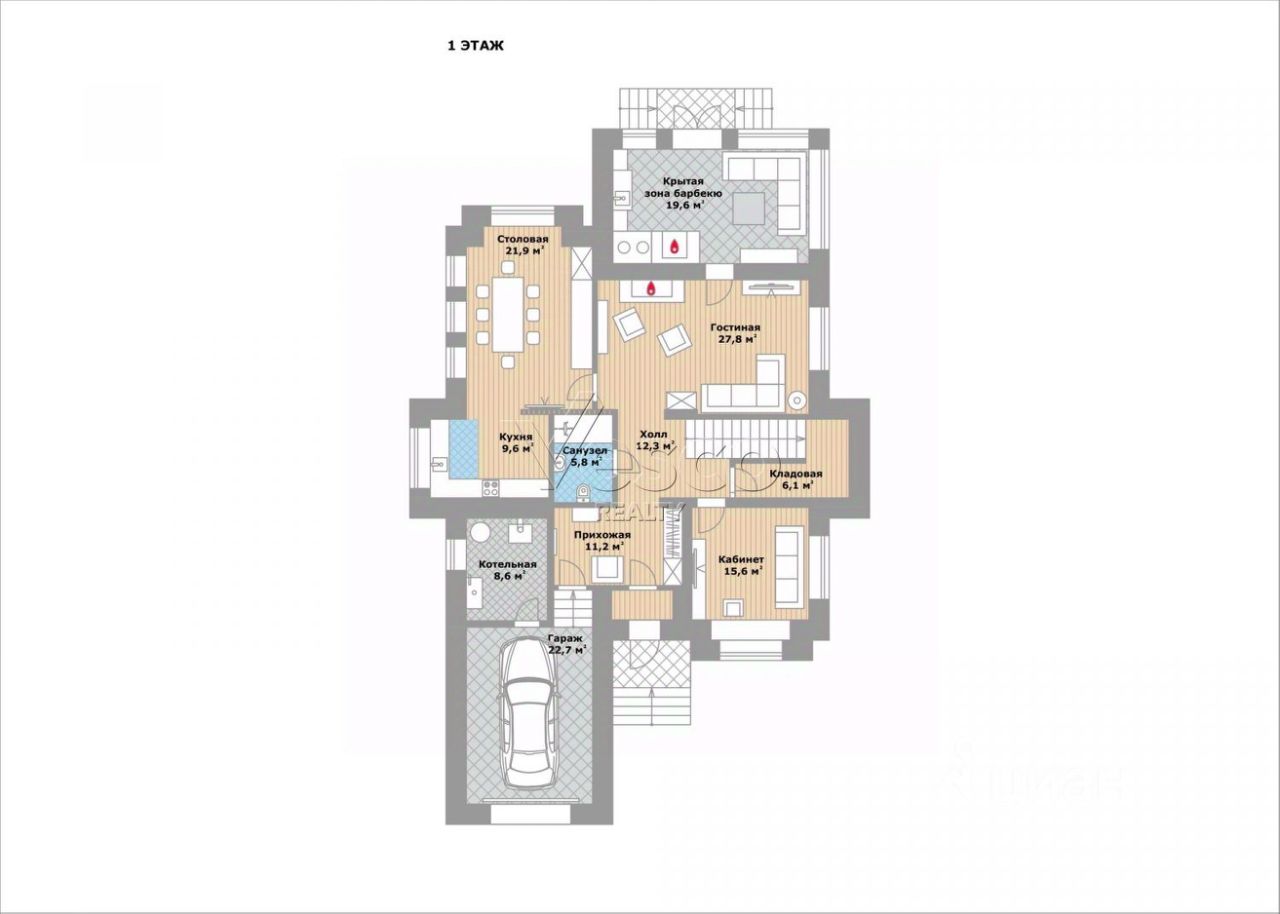 Прихожая (11,2), лестничный холл (12,3), гостевой с/у (5,8), кухня (9,6), столовая (21,9), гостиная (27,8) с выходом на застекленную террасу с зоной барбекю (19,6), кабинет (15,6), гараж (22,7), кладовая (6,1), котельная (8,6).