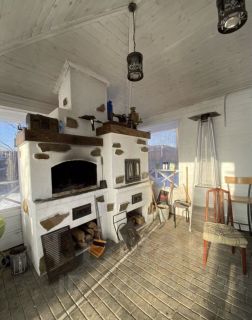 На участке обустроена уютная беседка с настоящей русской печью и удобным хозяйственным блоком, создающими атмосферу тепла и уюта.