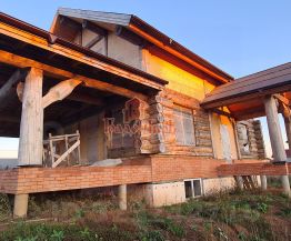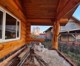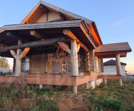Возведен из рубленного бревна (380 - 420 мм) на залитом армированном фундаменте с полноценным подвалом и с перекрытием 1 этажа монолитной ж/б плитой. Заложены коммуникационные гильзы. Подготовлены все точки подключения сантехники и электрики. В стоимость дома включен утеплитель и мягкая кровля.