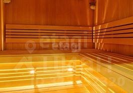 - в сауне установлена стеклянная дверь для сауны Tylo с бронзовым стеклом и магнитным замком (производитель- Финляндия), а так же печь Tylo с сухим и влажным паром. Выполнены полки и спинки из липы Экстра. Сауна требует доработки