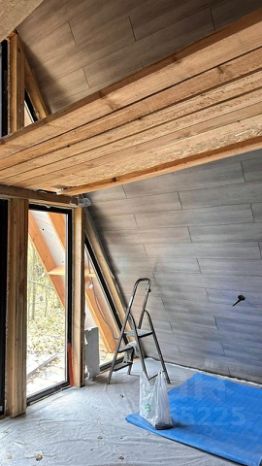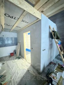 Внутренняя отделка: пол -керамогранит, ламинат, ванная комната - плитка в душевой зоне, кухонная зона -испанская плитка (фартук), стены- штукатурка)
