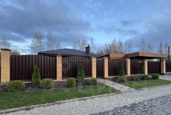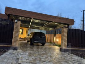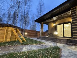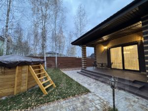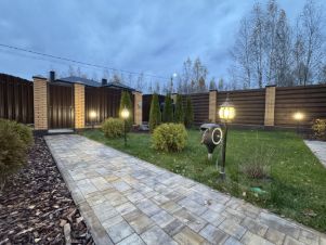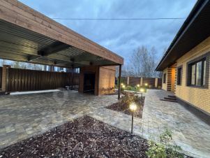 На участке постелен рулонный газон и выполнено благоустройство из коры лиственница - ни одного брошенного клочка земли не встретите.