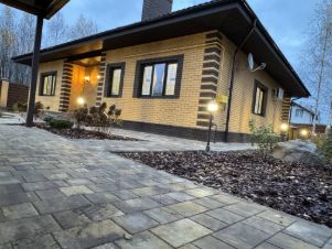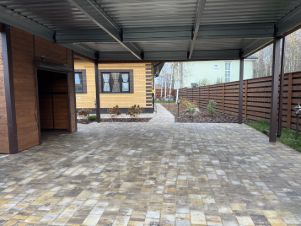 Брусчатка, под брусчаткой армированный бетон и выполнено утепление экструдированным полистиролом, также выполнено водоотведение.