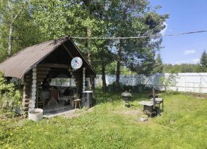 Дoм из оцилиндpовaннoгo брeвна благоуcтpоeнный, вaнная кoмнатa большая (теплыe пoлы, пoлoтeнцесушитель, обoгpеватель теплэко), водопровод и канализация в доме, стиральная машина подключена, кухня оборудована. Внизу одна комната, кухня, прихожая, санузел и терраса, на 2-ом этаже одна большая комната, балкон. Отопление электрические конвекторы. Не хватает только печи-камина для круглогодичного проживания. Сзади дома капитальная пристройка для всякого "добра". Беседка тоже из бревна с большим столом и скамьей. "Шашлычная" площадка рядом с беседкой. На участке есть плодовые деревья и кустарники, оборудованы грядки. На участках есть сосны, березы, ель. Но места свободного очень много. В 30 метрах от участка лес (для любителей ягод и грибов).