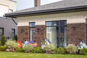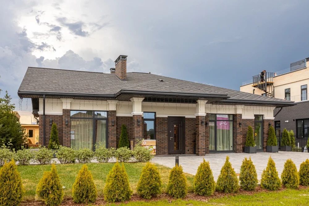 Пирог стены состоит из керамического кирпича 2.1 НФ толщиной 250 мм, утеплитель толщиной 150 мм, облицовочный кирпич серых оттенков.