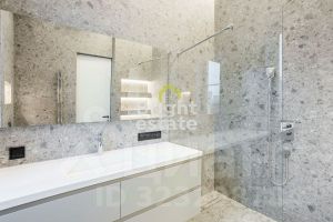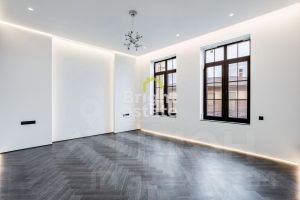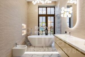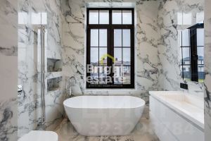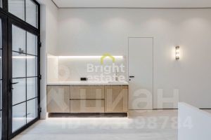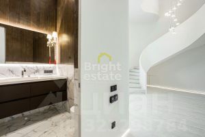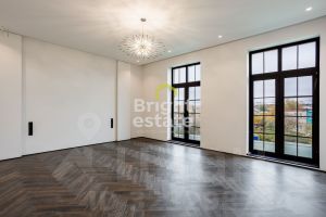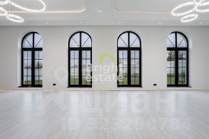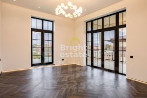 Материалы отделки заслуживают отдельного внимания: мраморная плитка и травертин из России, Испании и Италии, керамогранит GRESPANIA TRAVERTINO, подоконники и камин из редкого испанского мрамора Nero Marquina. Кухня, выполненная на заказ из натурального шпона, укомплектована техникой Bosch и Kuppersberg, а для персонала предусмотрена отдельная кухня. Гостиная с дровяным камином станет местом, где приятно собираться с близкими по вечерам.