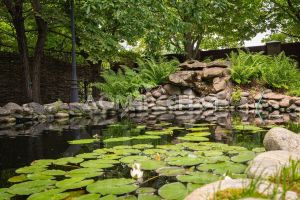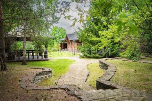 Ровный участок логической формы, ороген забором на бетонном основании. Растет множество хвойных и лиственных деревьев. Декоративный пруд с карасями. Дорожки и парковка вымощены брусчаткой, смонтировано уличное освещение. Деревянная баня и летняя беседка.