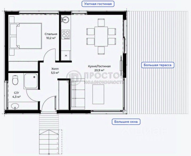2.Планировка, где продумано всё: открытая терраса для барбекю, просторная кухня-гостиная, изолированная спальня и санузел с душем.