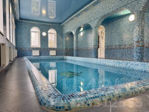 • Первый этаж: бассейн 10 м 4 м 2,5 м, комната отдыха с выходом в сад, постирочная, душевая, сауна, массажный кабинет, санузел.