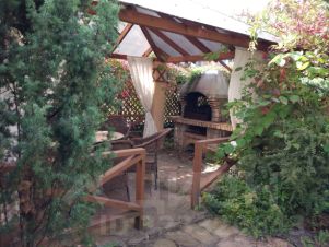 Огороженая лужайка с ландшафтным дизайном - деревьями, цветами и газоном, беседка с камином-барбекю и обеденной зоной. Собственная стоянка с навесом на три автомобиля перед домом.