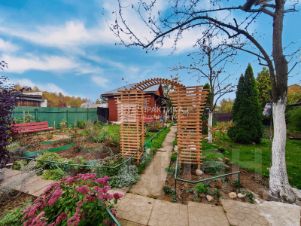 Высажены плодовые кусты, взрослые деревья, очень много цветов.