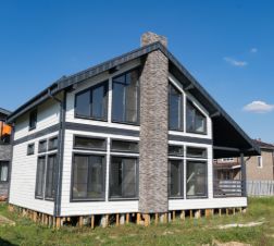Интересное решение по внешнему фасада - комбинированная отделка фиброцементный сайдинг Каньон и панели Decover.
