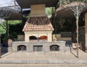 Дом облицован долговечными материалами - цоколь и фонтан выполнены из базальта, натурального камня темных природных оттенков. Фасад в более светлых тонах и облицован ферзитом, натуральным камнем, близким по своим свойствам к граниту. Кровля керамическая черепица производство Италия.