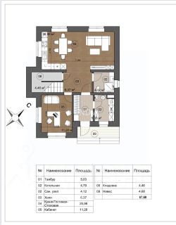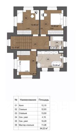В доме: на первом этаже - кухня-гостиная, спальня, санузел, кладовка, техническая комната (котельная); на втором этаже мастер- спальня, две спальни и санузел.