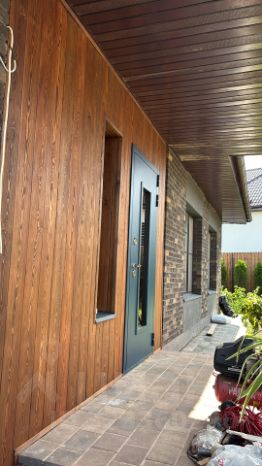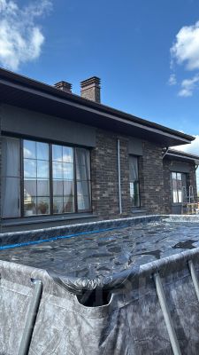 Фундамент монолит - ж/б плита плюс лента, стены из пеноблока, облицованы клинкерным кирпичом, окна из профиля Rеhаu с двухкамерными стеклопакетами, мягкая кровля КАТЕРАL.