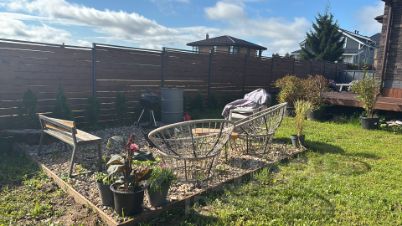 Участок расположен в середине поселка, на горке, с небольшим уклоном сухой. Начали делать ландшафтный дизайн, засеян газон и посажен сад. Парковка для 2 а/м.