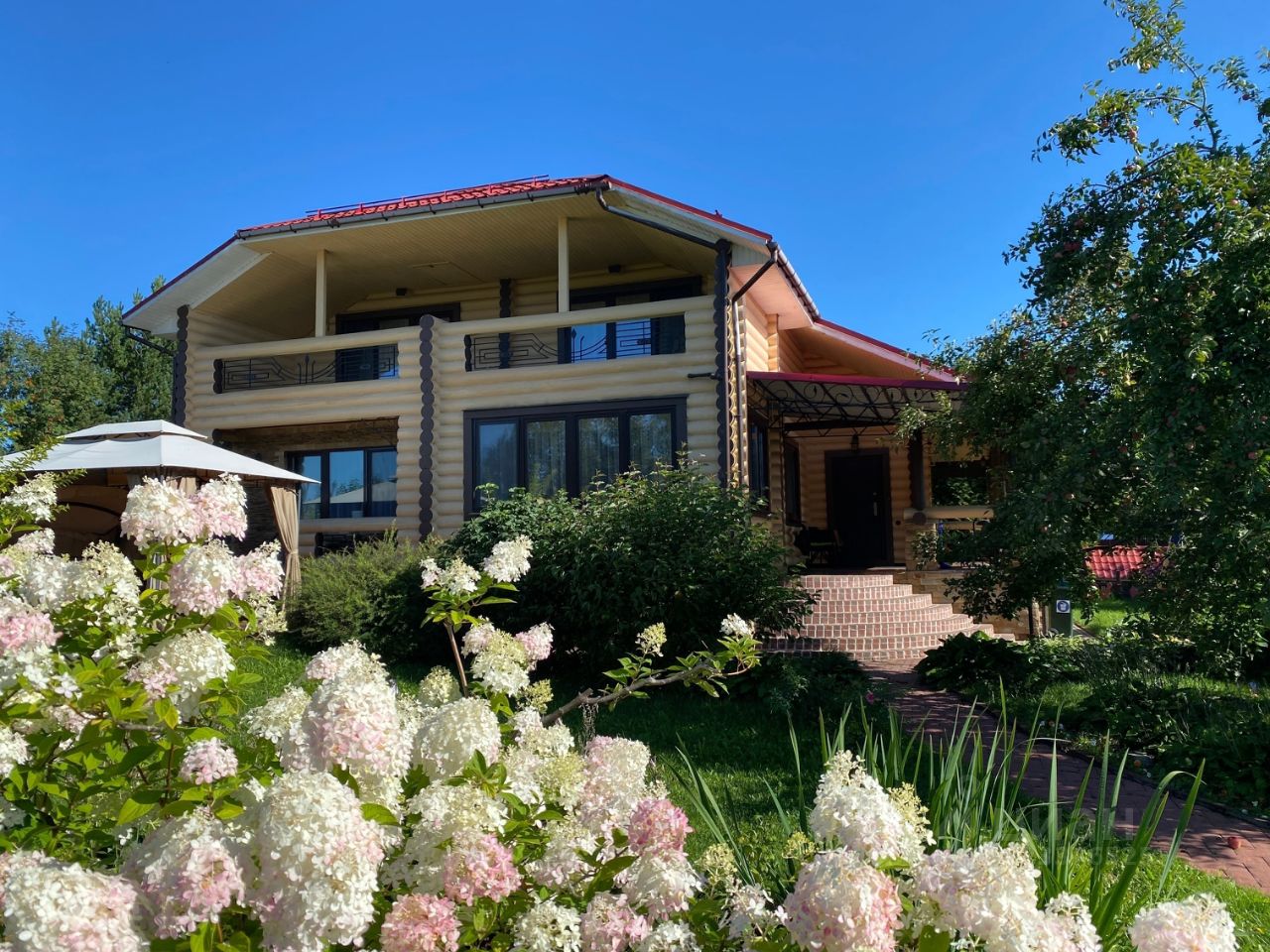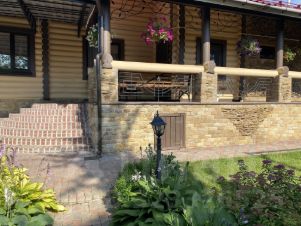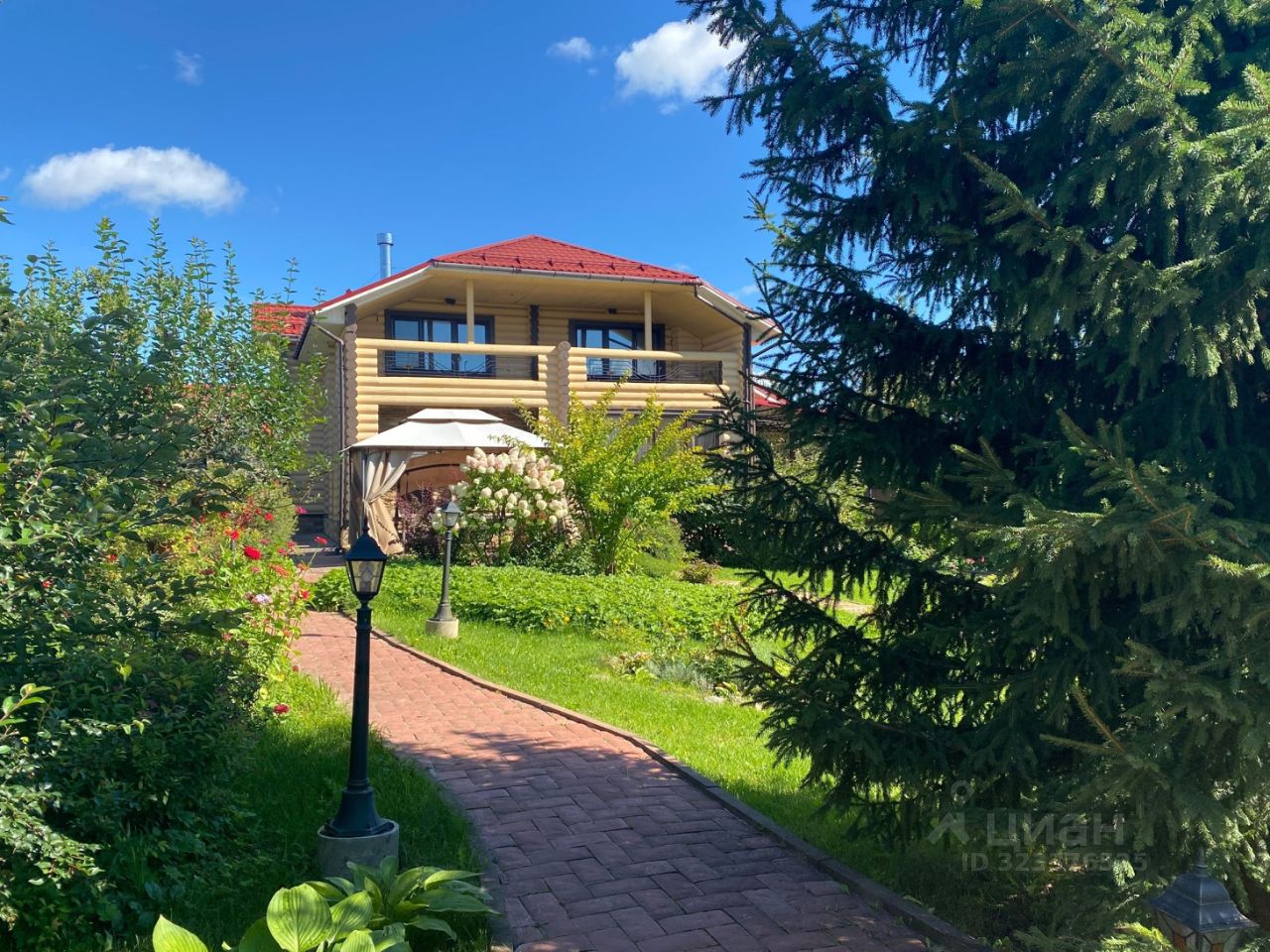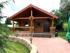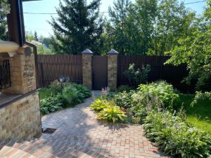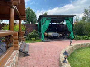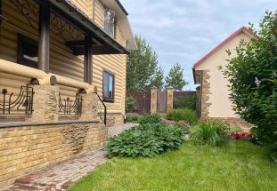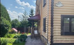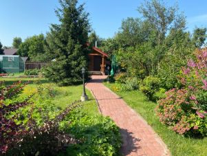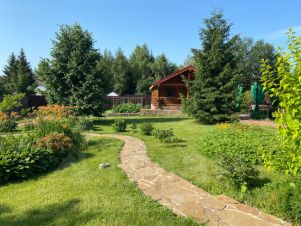 На участке проведены ландшафтные работы: постелен газон, посажены декоративные кустарники, цветы, плодовые деревья; организованы уличное освещение, система полива и дренажа. На участке расположена бревенчатая баня 8,5х6м с купелью (купель с фильтрацией и подогревом), парная отделана липой. Также есть зона барбекю, детская площадка с качелями и спортивная площадка, гараж на одну машину с автоматическими воротами, открытая парковка с откатными воротами. Заезд на участок с двух сторон.