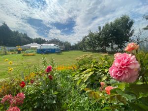 - 2 теплицы с капельным поливом, грядки, плодовые растения: жимолость, смородина, крыжовник, малина ремонтантная, ежевика, клубника, облепиха, груша, яблоня и др.;