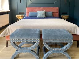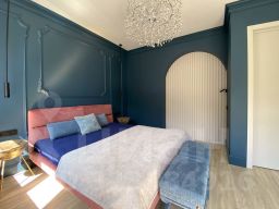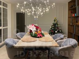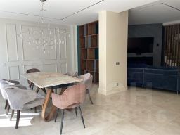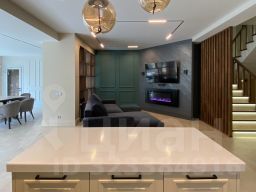 Особое внимание заслуживает лестница из натурального дуба с увеличенной площадкой под 90 градусов, декоративные панели так же выполнены из натурального дуба под заказ. Все двери в доме нестандартной высоты 2,4 м, что добавляет особую атмосферу пространства.