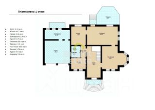 На первом этаже расположены просторная гостиная, кухня-столовая, холл, гостевая спальня, санузел, постирочная, котельная и гараж.