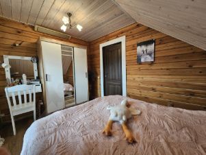 На первом этаже дома находится: открытая веранда 20м2, прихожая, санузел с душевой кабиной, кухня, каминный зал. На втором этаже одна комната проходная с выходом на чердак и еще две спальные комнаты.