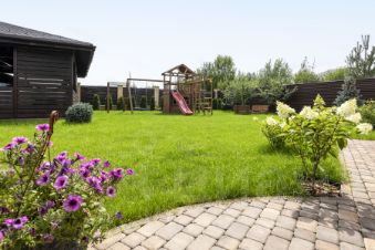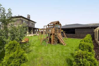 Благоустроенный и ухоженный земельный участок, с заездом с двух сторон. На участке выполнен ландшафтный дизайн. Идеальный газон, высажены большие туи и хвойные деревья, растет сирень, гортензии, плодовые деревья и кустарники. Большая въездная зона и дорожки выложены брусчаткой. Установлена деревянная детская площадка с горками и качелями. Выполнен дренаж участка. В едином архитектурном стиле построен навес на 3 автомобиля с отдельным въездом и блоком для хранения. Навес оборудован освещением.