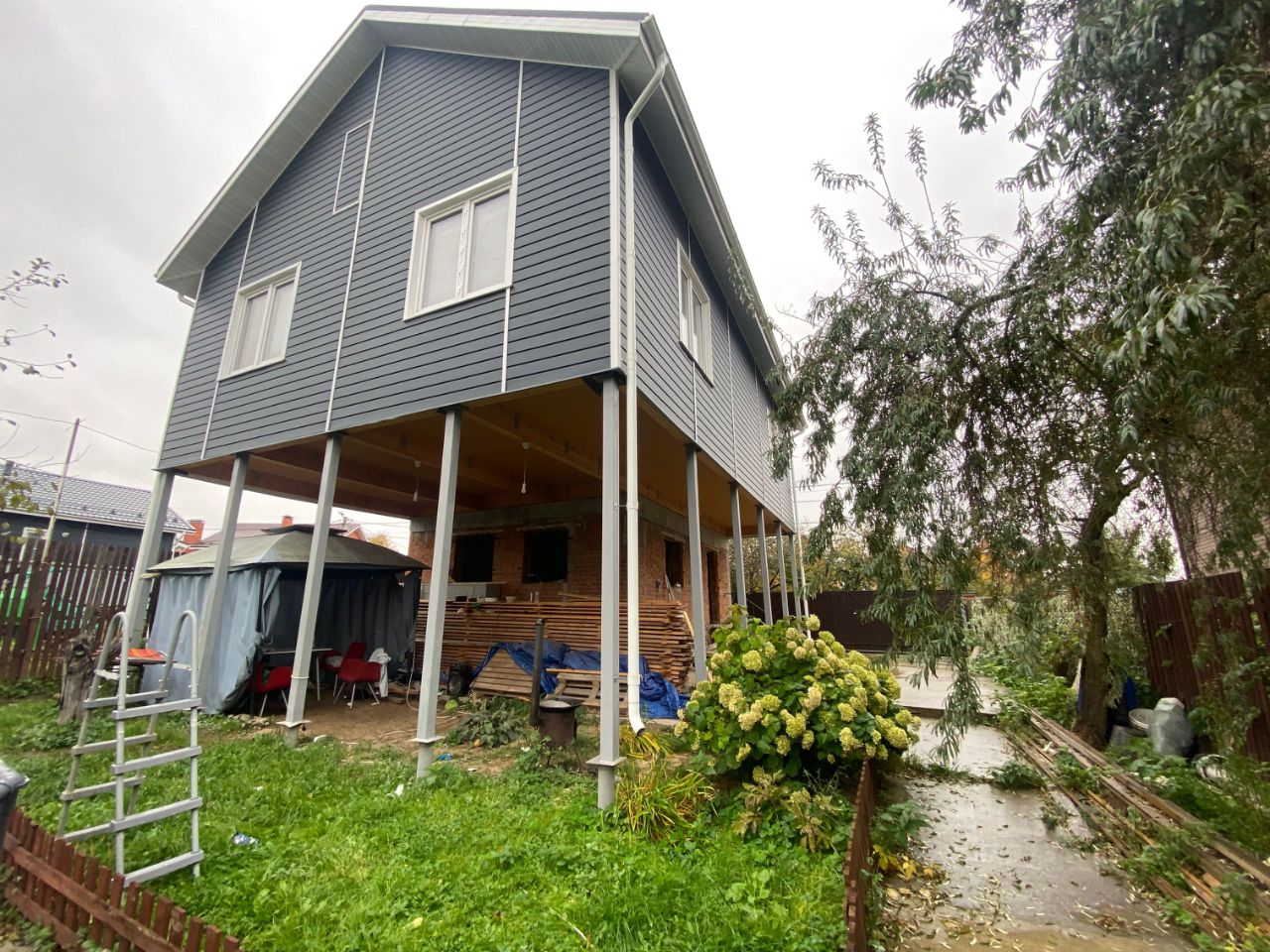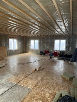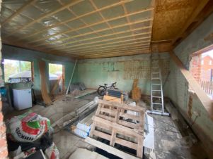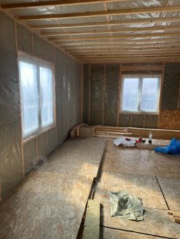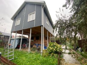— второй этаж на сваях, материал стен: деревянный каркас, доска, паро изоляция, утеплитель — мин.вата, установлены пластиковые окна, предусматривает 3 спальных комнаты и сан.узел.