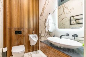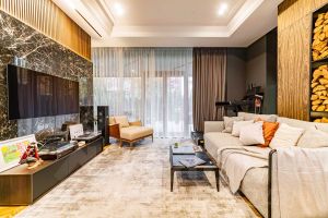На первом этаже прихожая, кухня-столовая с выходом на террасу, гостиная с камином и санузел. Второй этаж включает мастер-спальню с гардеробной и спальню с отдельным санузлом. Третий этаж кабинет с выходом на эксплуатируемую кровлю.