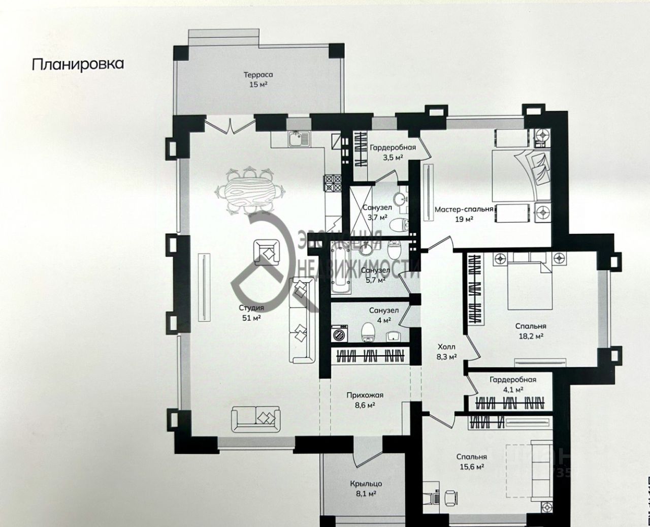 На фото представлен один из вариантов в полной комплектации мебелью и техникой