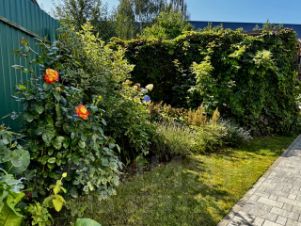 Участок правильной формы с ландшафтным дизайном, плодовыми деревьями, уютной зоной патио и мангалом.