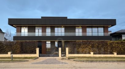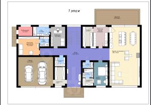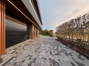 - 1 этаж: зона кухня-гостиная с выходом на открытую террасу, рабочая кухня с двумя отдельными входами (с дома и с участка), спальня с санузлом и гардеробной, кабинет с санузлом, комната для персонала с отдельным входом с участка и своим санузлом, котельная, построчная, гостевой санузел, прихожая с гардеробной и сквозным проходом в гараж;